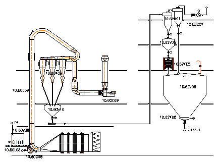 ⑵ 離心風機負壓吸送是稀相輸送,主要是設計好輸送風量、固氣比、風壓、輸送管道直徑、卸料旋風分離器。輸送量為16.67t/h,風速為35m/s,物料密度為0.1%。